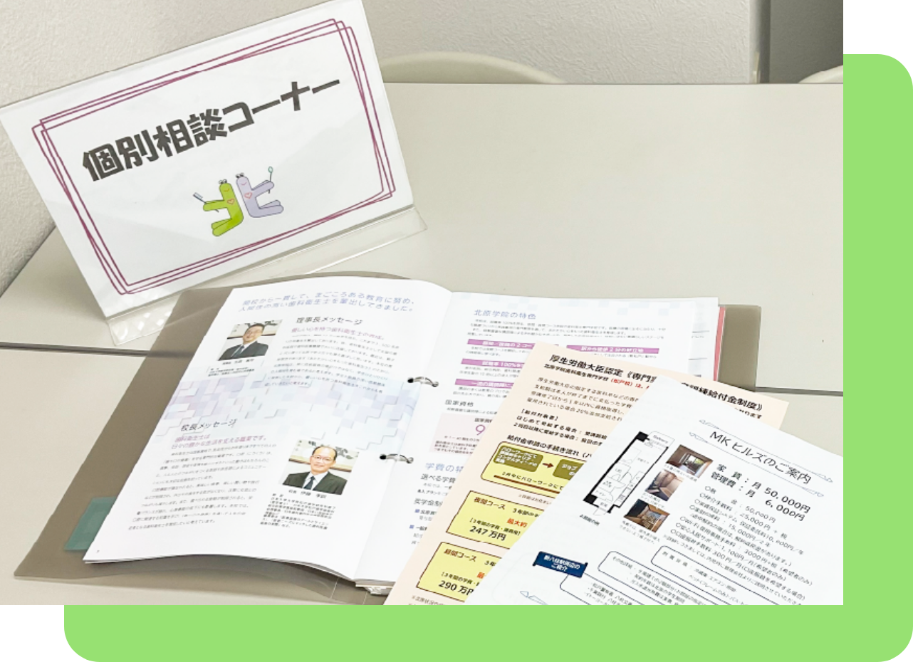 個別相談コーナーでは、学費・入試のことなどお気軽にご相談ください。